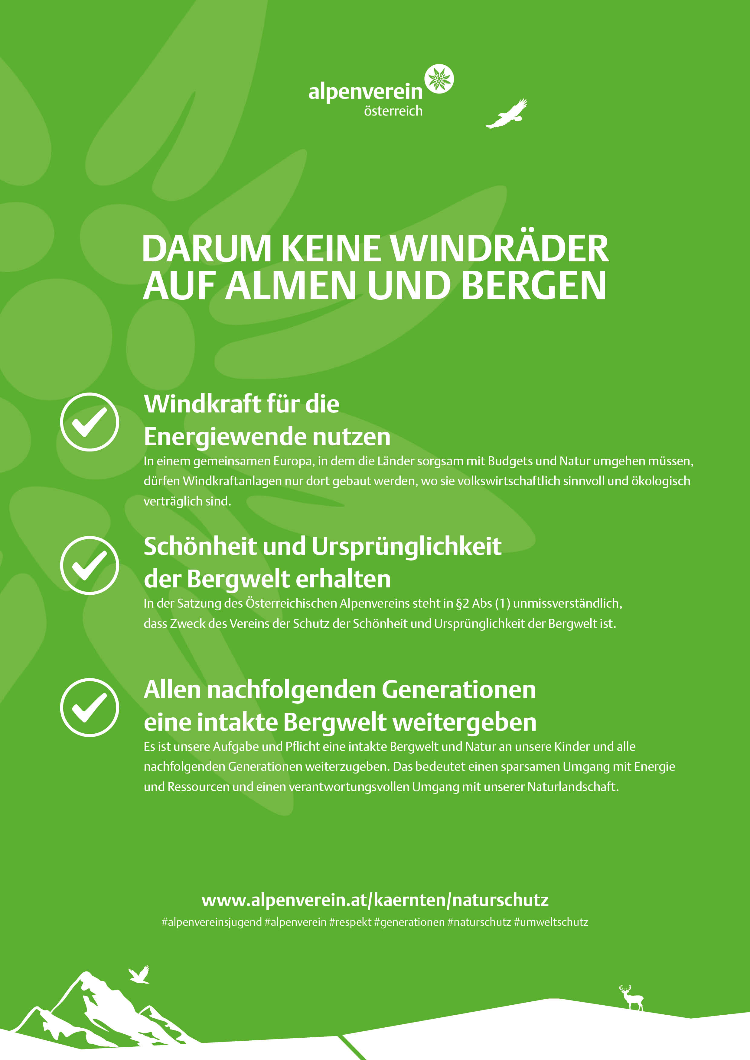 Glücklicherweise gibt es unzählige Menschen in ganz Österreich, denen die Schönheit und Unberührtheit der Bergwelt am Herzen liegen. Der großteils ehrenamtliche Kampf gegen multinationale Konzerne, die die heimischen Berge und Almen mit Windindustrien finanz-/wirtschaftlich erschließen wollen, gleicht dennoch "David gegen Goliath".