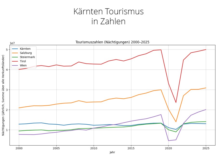 Im Vergleich zu Tirol, Salzburg, Wien und der Steiermark nimmt Kärnten eine stabile, aber strukturell andere Position ein. Während Tirol und Salzburg mit deutlich höheren Nächtigungszahlen die stärksten Tourismusregionen darstellen und stark vom internationalen Wintertourismus profitieren, bewegt sich Kärnten auf einem mittleren Niveau. Die Steiermark liegt in einer ähnlichen Größenordnung, verzeichnet jedoch in den letzten Jahren etwas dynamischere Zuwächse.